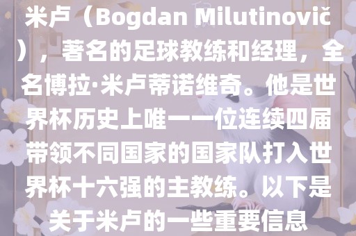 米卢(Bogdan Milutinovi?),著名的足球教练和经理,全名博拉·米卢蒂诺维奇。他是世界杯历史上唯一一位连续四届带领不同国家的国家队打入世界杯十六强的主教练。以下是关于米卢的一些重要信息