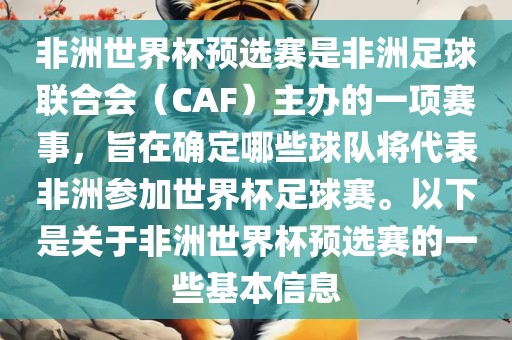 非洲世界杯预选赛是非洲足球联合会(CAF)主办的一项赛事,旨在确定哪些球队将代表非洲参加世界杯足球赛。以下是关于非洲世界杯预选赛的一些基本信息