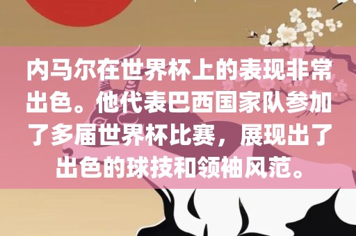 内马尔在世界杯上的表现非常出色。他代表巴西国家队参加了多届世界杯比赛,展现出了出色的球技和领袖风范。
