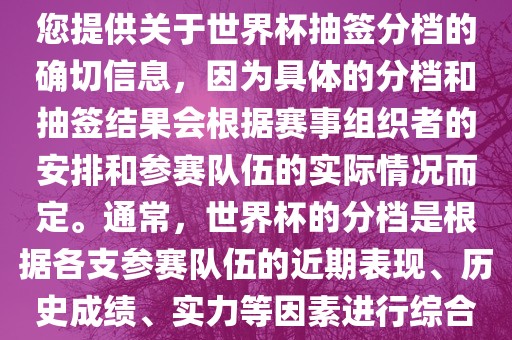 根据我所掌握的知识,无法为您提供关于世界杯抽签分档的确切信息,因为具体的分档和抽签结果会根据赛事组织者的安排和参赛队伍的实际情况而定。通常,世界杯的分档是根据各支参赛队伍的近期表现、历史成绩、实力等因素进行综合考虑的。