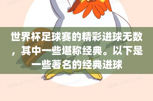 世界杯足球赛的精彩进球无数,其中一些堪称经典。以下是一些著名的经典进球