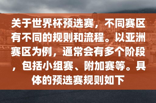 关于世界杯预选赛,不同赛区有不同的规则和流程。以亚洲赛区为例,通常会有多个阶段,包括小组赛、附加赛等。具体的预选赛规则如下