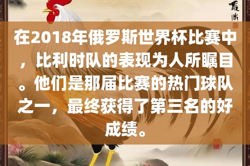 在2018年俄罗斯世界杯比赛中,比利时队的表现为人所瞩目。他们是那届比赛的热门球队之一,最终获得了第三名的好成绩。