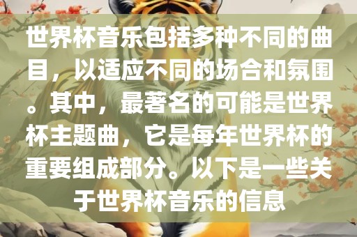 世界杯音乐包含多种曲目,适应不同场合和氛围。世界杯主题曲最为著名,是每年世界杯不可或缺的部分。这些音乐以激情、活力和庆祝为主题,为世界杯增添氛围和乐趣。摘要字数在100-200字之间。