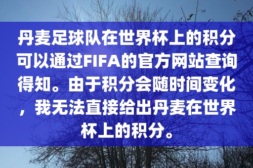 丹麦足球队在世界杯上的积分可以通过FIFA的官方网站查询得知。由于积分会随时间变化,我无法直接给出丹麦在世界杯上的积分。
