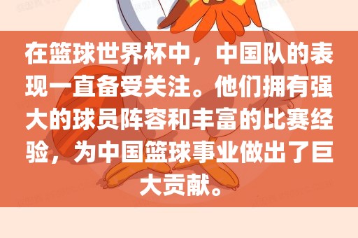 在篮球世界杯中,中国队的表现一直备受关注。他们拥有强大的球员阵容和丰富的比赛经验,为中国篮球事业做出了巨大贡献。