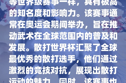 散打世界杯是世界武术散打最高水平的赛事之一,与奥运会同期举办,旨在推动武术的全球普及和发展。该赛事汇聚全球顶尖选手,展现散打运动的魅力,并促进不同国家和地区之间的文化交流。通过激烈的竞技对抗,选手们展现出散打的技巧、力量和美感。